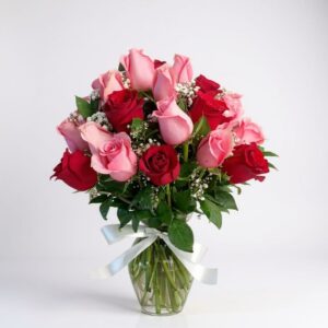 Florero de vidrio que incluye 18 rosas (rojas y amarillas) con follaje variado. Lindo detalle para sorprender en cualquier ocasión!