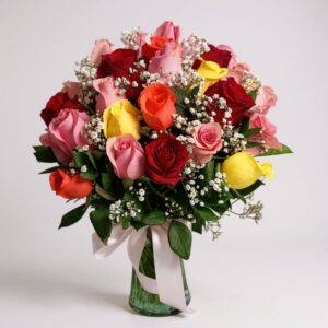 Un lindo arreglo que le alegra el día a cualquiera! 18 rosas de colores surtidos en un elegante florero de vidrio!
