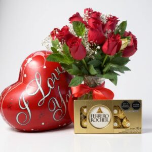 Práctico y hermoso ramo de 12 rosas rojas envueulto en papel especial, incluye una caja de chocolates Ferrero ROCHER T( y un topper trupan “Love”