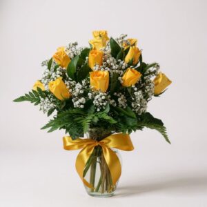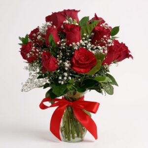 12 rosas rojas en florero de cerámica