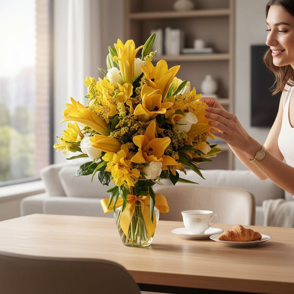 Una composición que transmite serenidad, luz y alegría con sofisticación natural. Este florero reúne 8 rosas blancas de tallo largo—símbolo de paz y gratitud—acompañadas por 3 tallos de lirios en tonos amarillo y naranja que aportan energía y volumen, y 4 ramas de astromelias amarillas que suman textura, frescura y vitalidad. El resultado es un arreglo armonioso, ideal para regalar o decorar con intención emocional y estética refinada.