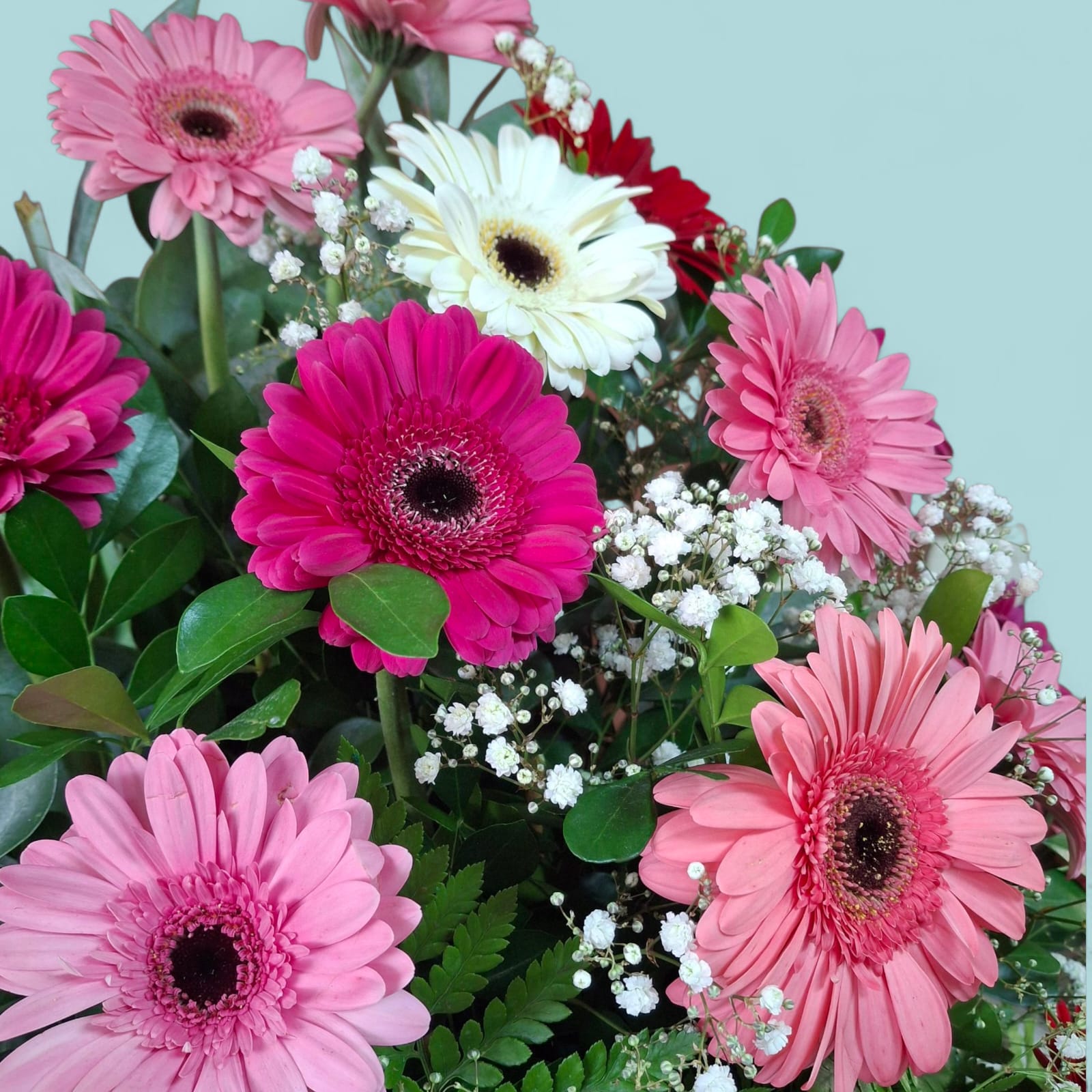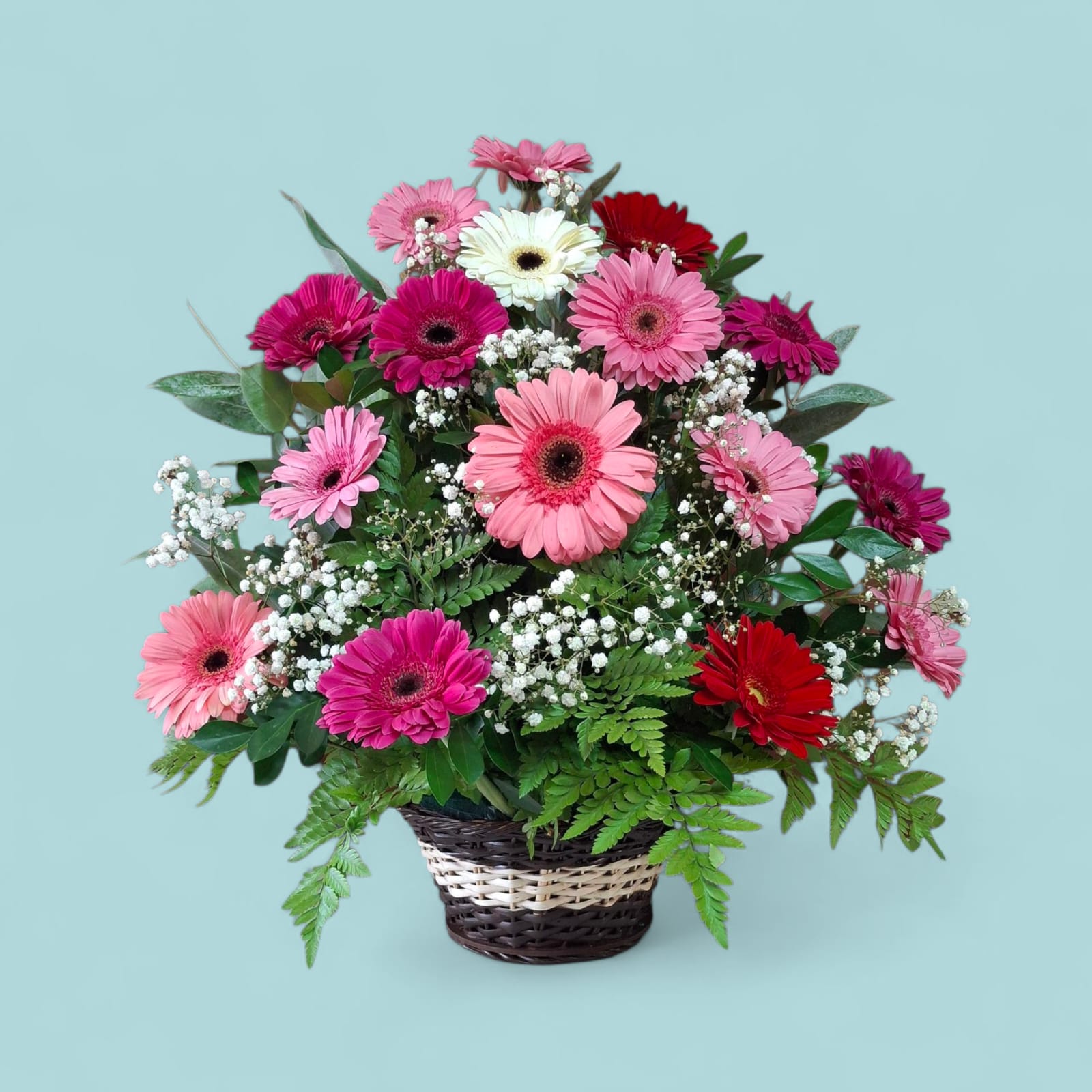 Una expresión de ternura y frescura natural. Esta encantadora canasta floral reúne 16 gerberas rosadas de pétalos vibrantes, cuidadosamente seleccionadas y dispuestas con arte entre follajes variados que aportan textura, volumen y elegancia. El resultado es una composición armoniosa, femenina y luminosa, ideal para transmitir cariño, gratitud o admiración con un toque de sofisticación.