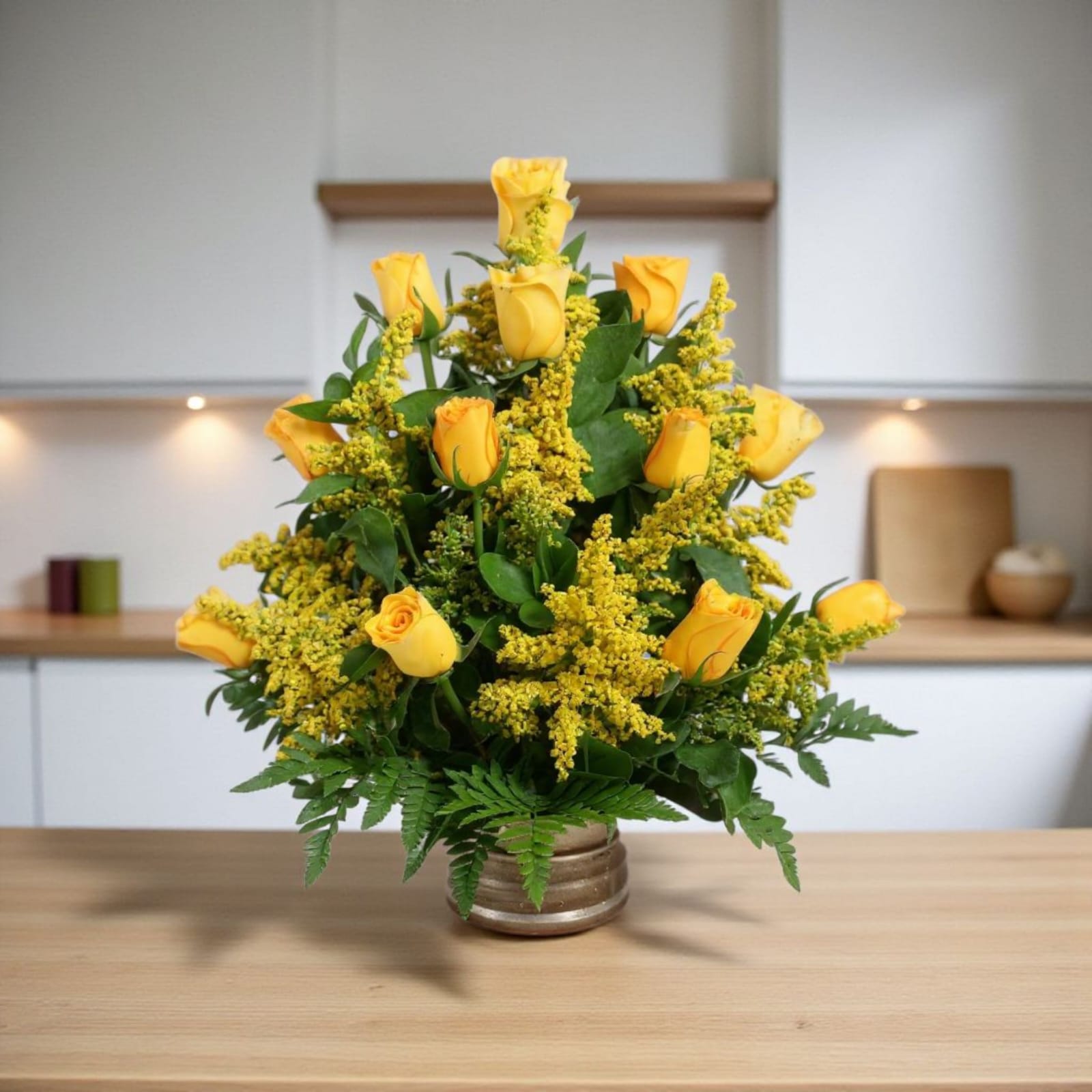 Una composición que irradia alegría, gratitud y energía positiva. Este arreglo presenta 12 rosas amarillas de tallo medio, cuidadosamente acomodadas en una base de cerámica que aporta estabilidad, elegancia y presencia visual. Acompañadas por follajes frescos y decorativos, las rosas amarillas transmiten cercanía y optimismo con estilo.