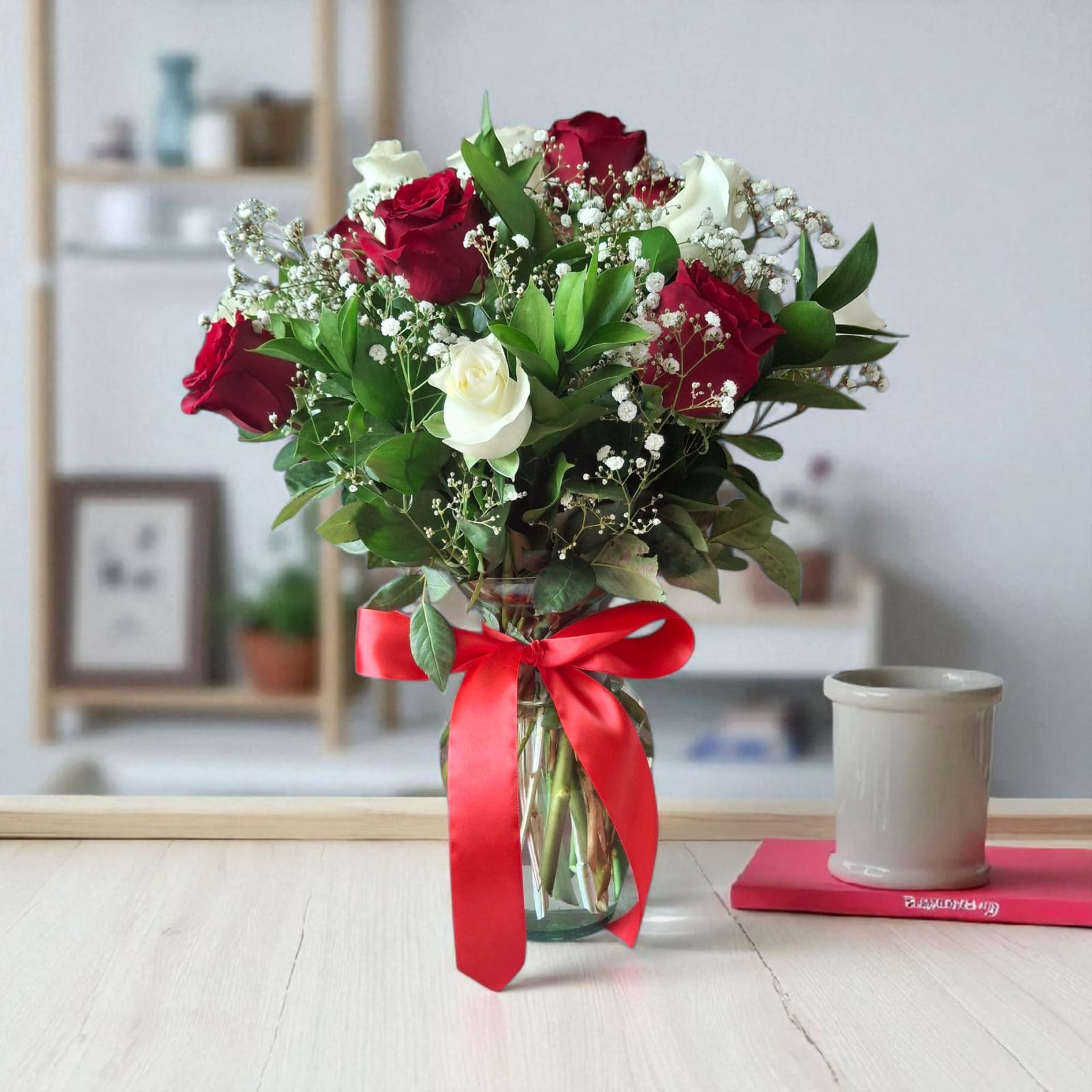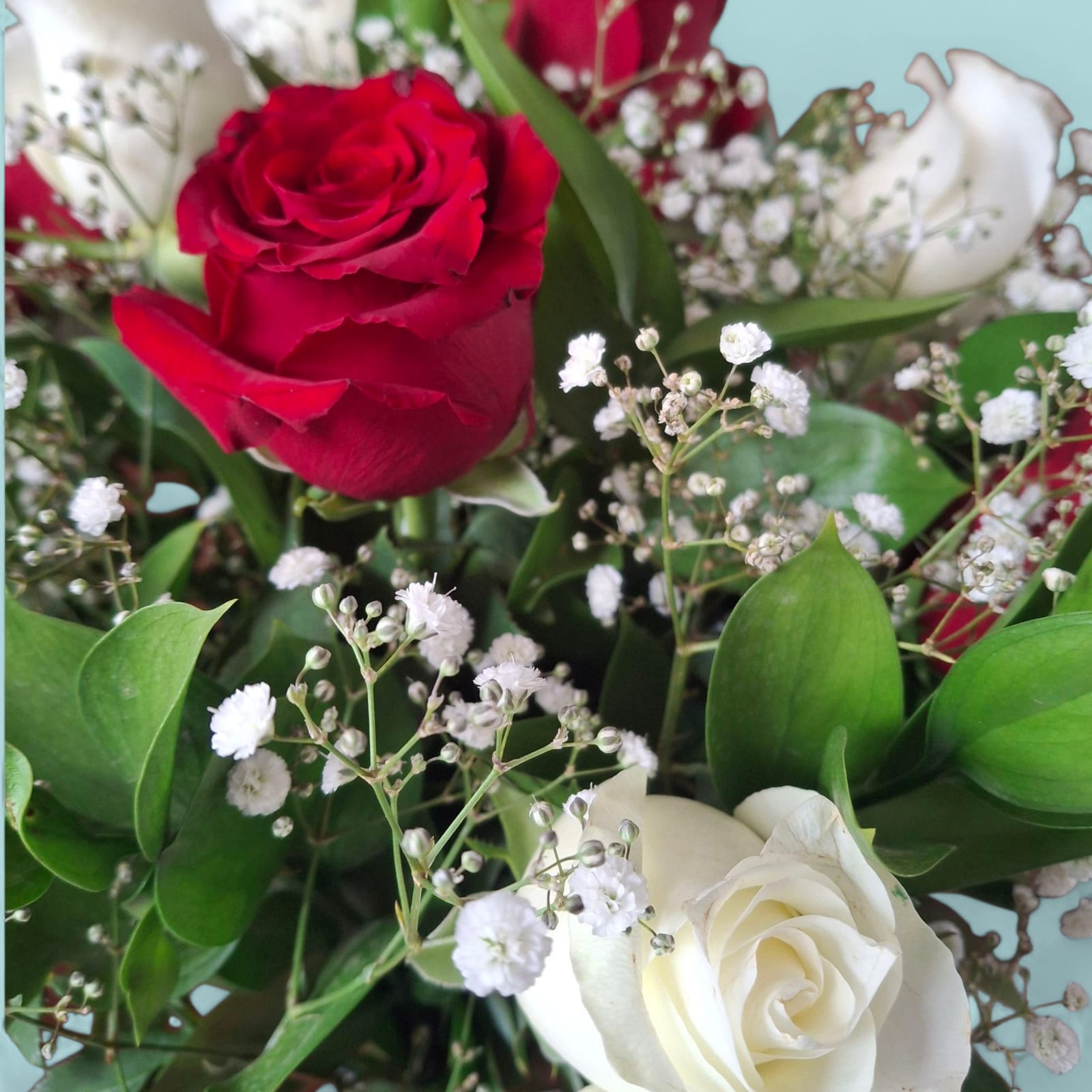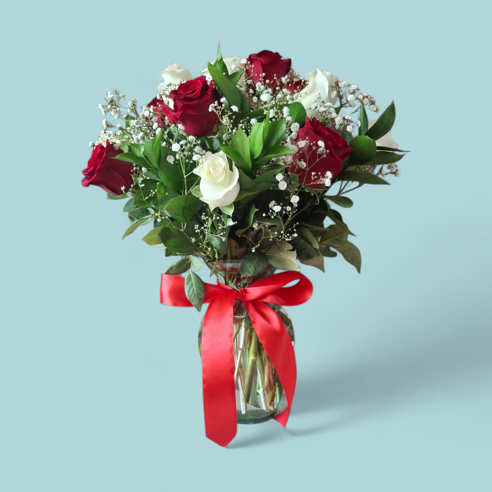 Un arreglo que equilibra pasión y pureza con estilo. Este florero reúne 12 rosas frescas—6 blancas y 6 rojas—cuidadosamente seleccionadas y dispuestas entre follajes finos para crear una composición armoniosa y visualmente impactante. Las rosas rojas expresan amor profundo y admiración, mientras las blancas transmiten paz, respeto y buenos deseos. Juntas, forman un gesto elegante que habla desde el corazón.
