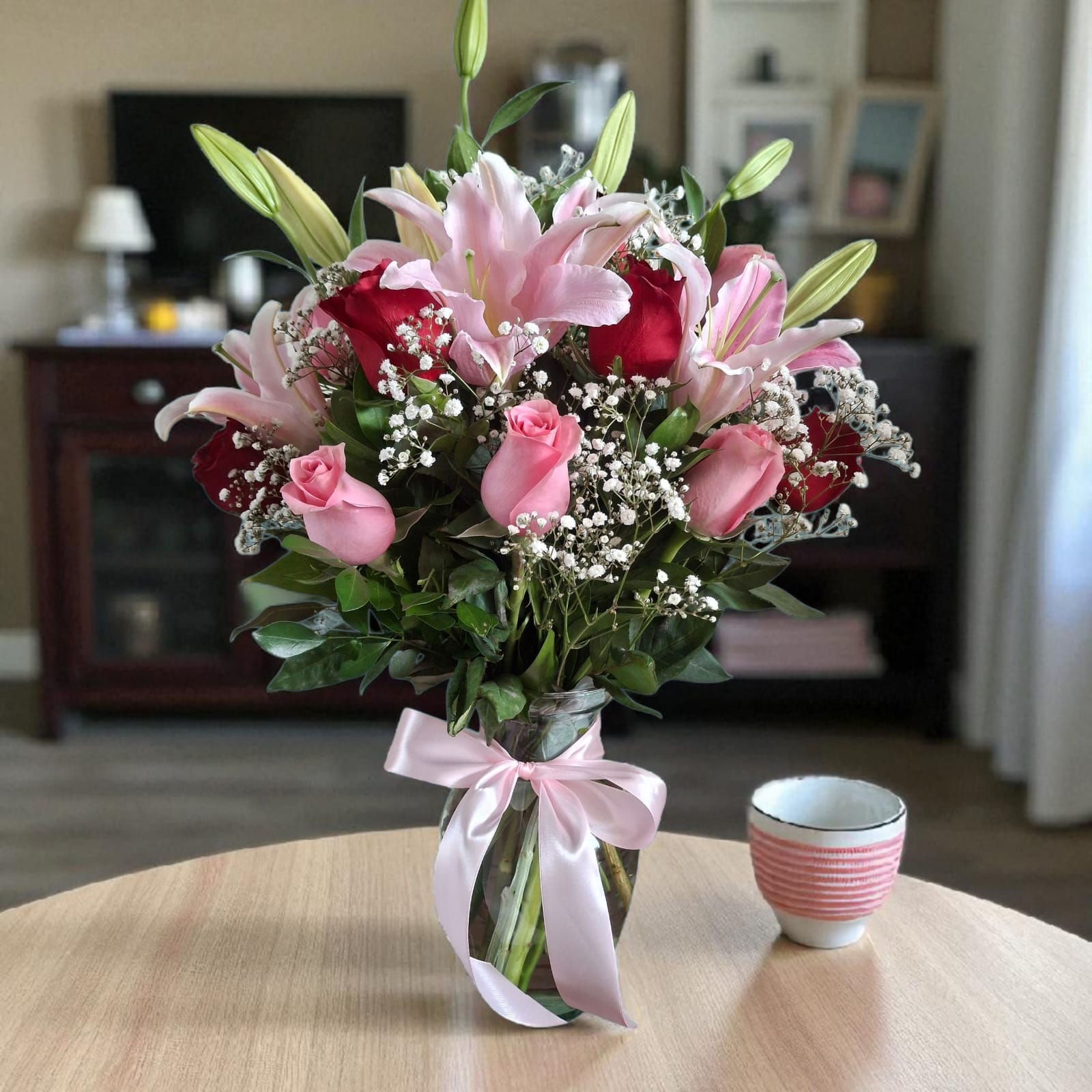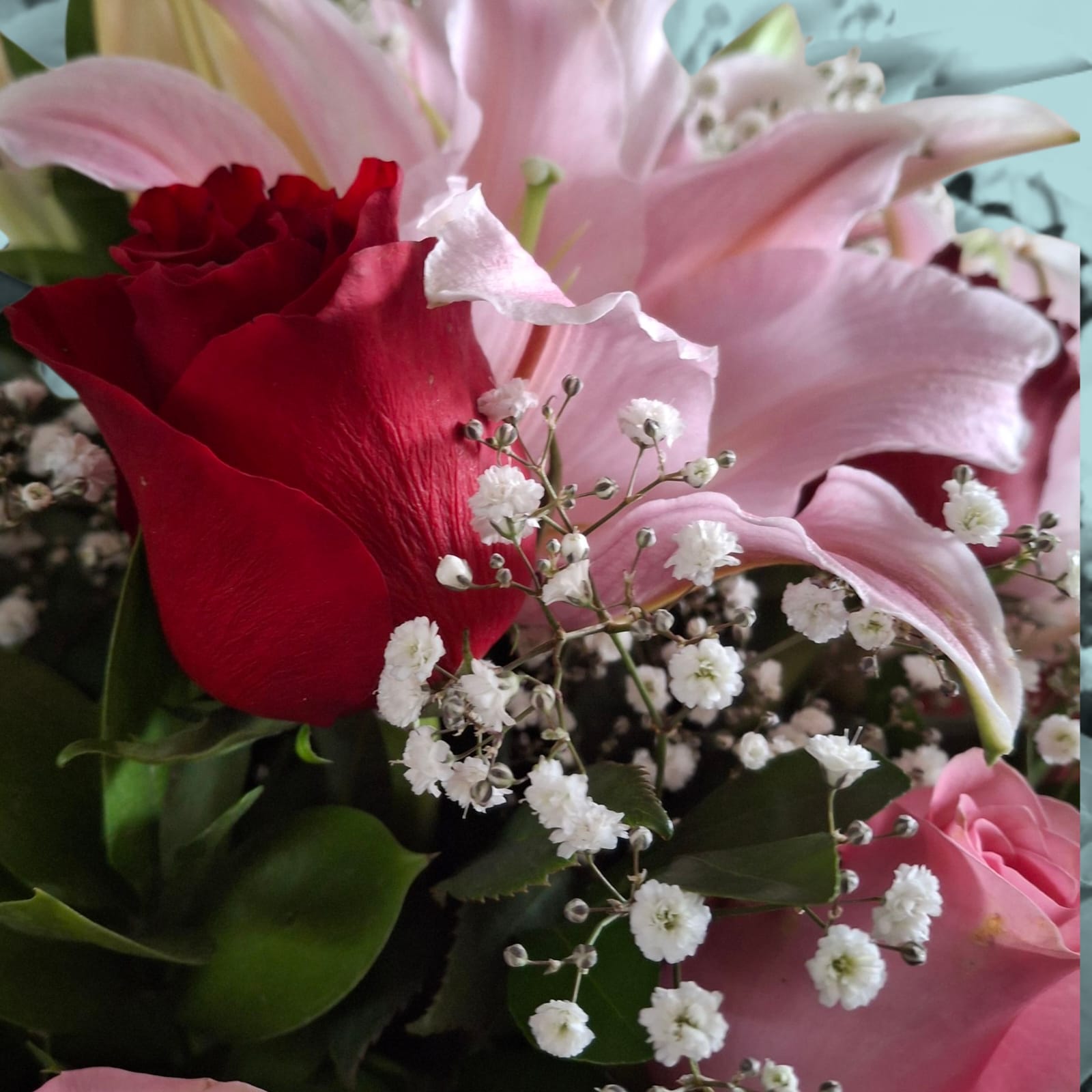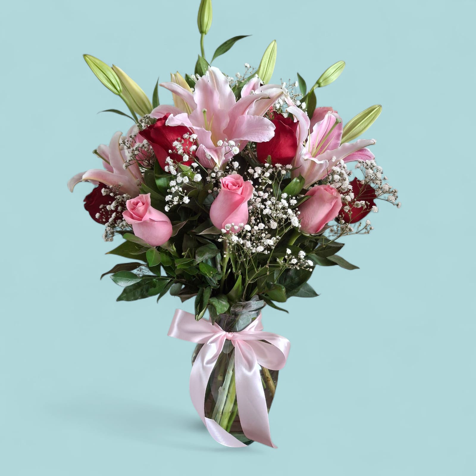 Una composición que equilibra pasión, ternura y elegancia. Este florero reúne 10 rosas frescas en tonos rojos y rosados—símbolos de amor profundo y afecto sincero—acompañadas por 3 ramas de lirios rosados que aportan sofisticación, volumen y un toque romántico. El contraste entre los colores cálidos y la delicadeza de los lirios crea un arreglo armonioso, ideal para transmitir emociones con estilo.