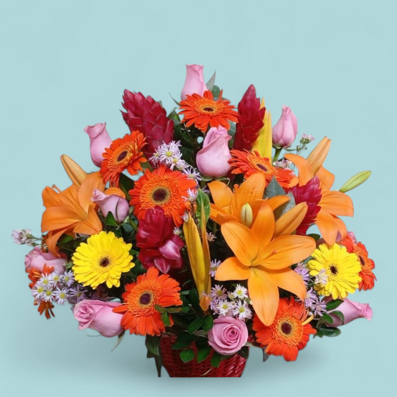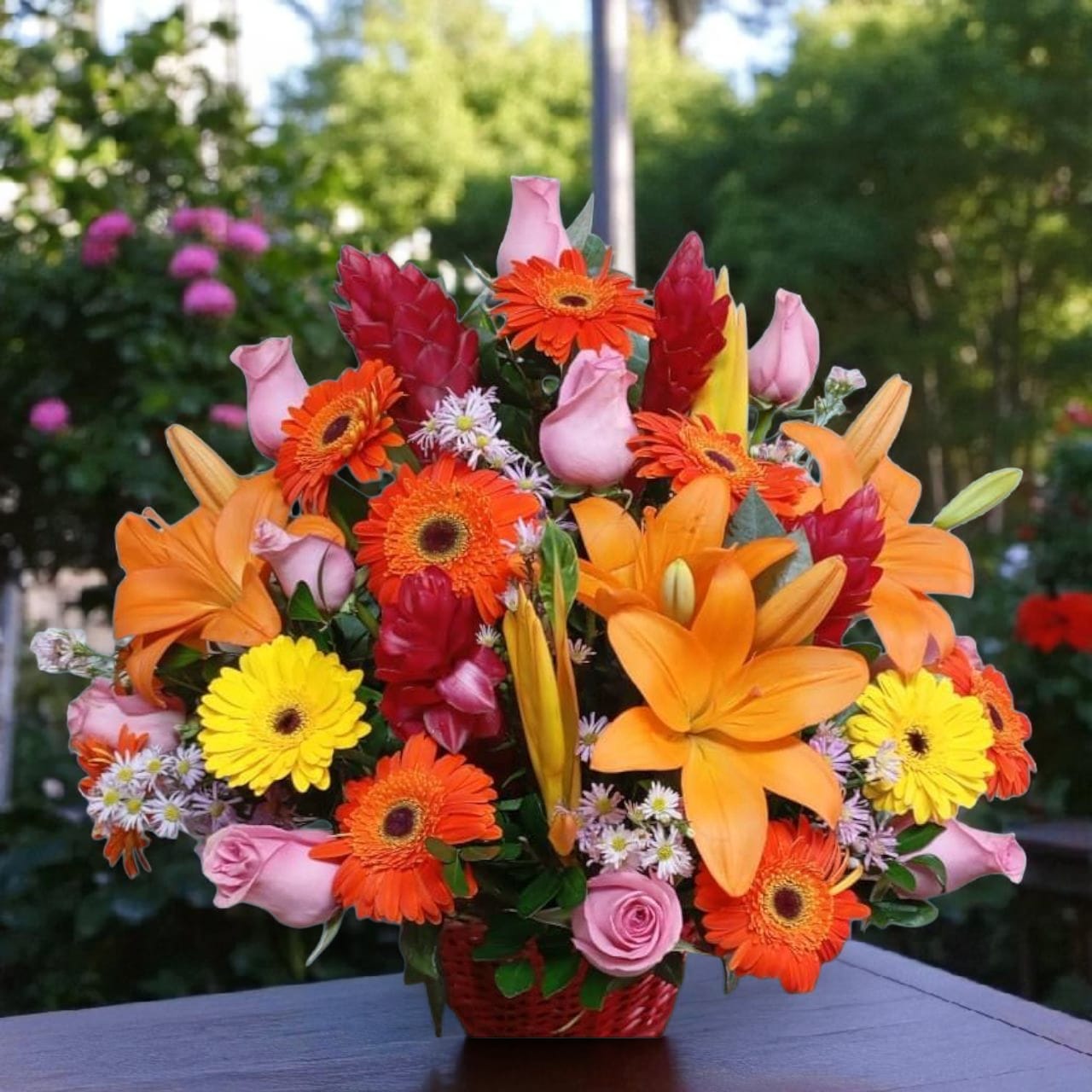 Una composición que celebra la frescura, el color y la belleza natural. Esta canasta reúne gerberas vibrantes y rosas delicadas, acompañadas por una selección de flores de temporada que aportan textura, volumen y carácter único. Cada arreglo se diseña con sensibilidad estética y equilibrio cromático, adaptándose a la estación para ofrecer siempre una propuesta visualmente armoniosa y emocionalmente significativa.