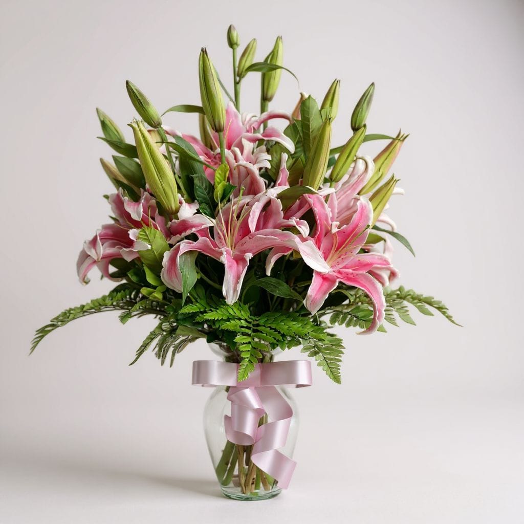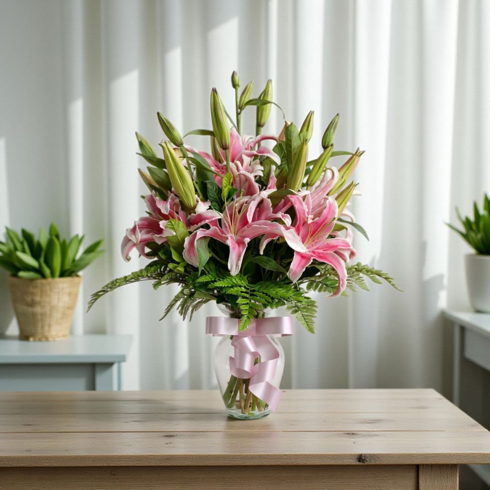 Una composición que irradia ternura, sofisticación y belleza escultural. Este florero presenta 5 tallos de lirios rosados, cada uno con múltiples flores abiertas y capullos en desarrollo, cuidadosamente seleccionados por su frescura y armonía visual. Los lirios rosados evocan afecto, feminidad y sensibilidad, convirtiendo este arreglo en un gesto encantador que transforma cualquier espacio con elegancia y emoción.