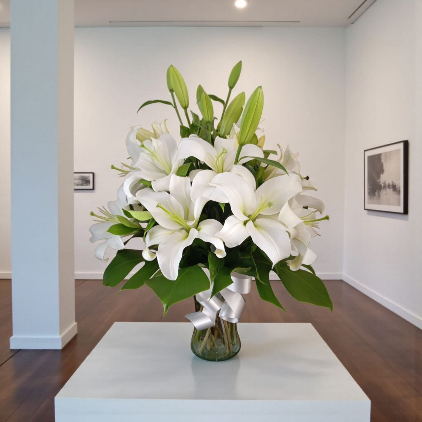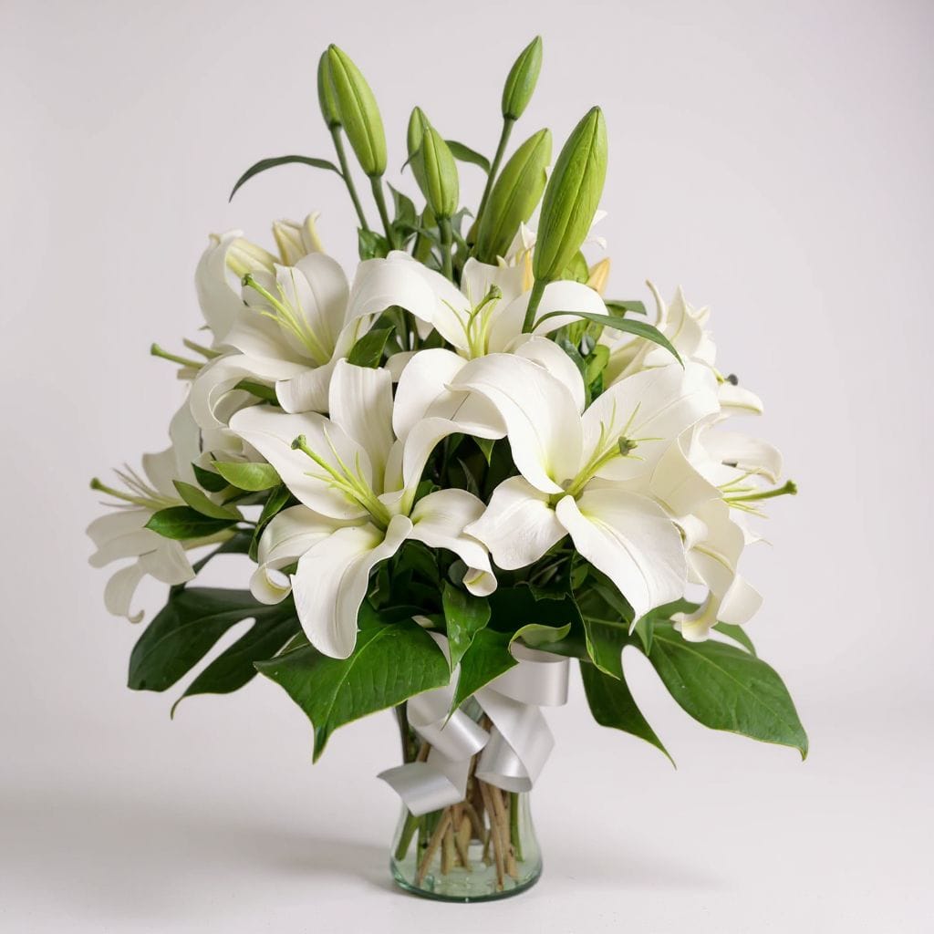 Una composición que transmite paz, elegancia y pureza. Este florero presenta 5 tallos de lirios blancos, cada uno con múltiples flores abiertas y capullos en desarrollo, cuidadosamente seleccionados por su frescura y forma escultural. Los lirios blancos evocan serenidad, respeto y renovación, convirtiendo este arreglo en un gesto sobrio y sofisticado que transforma cualquier espacio con luz y armonía.
