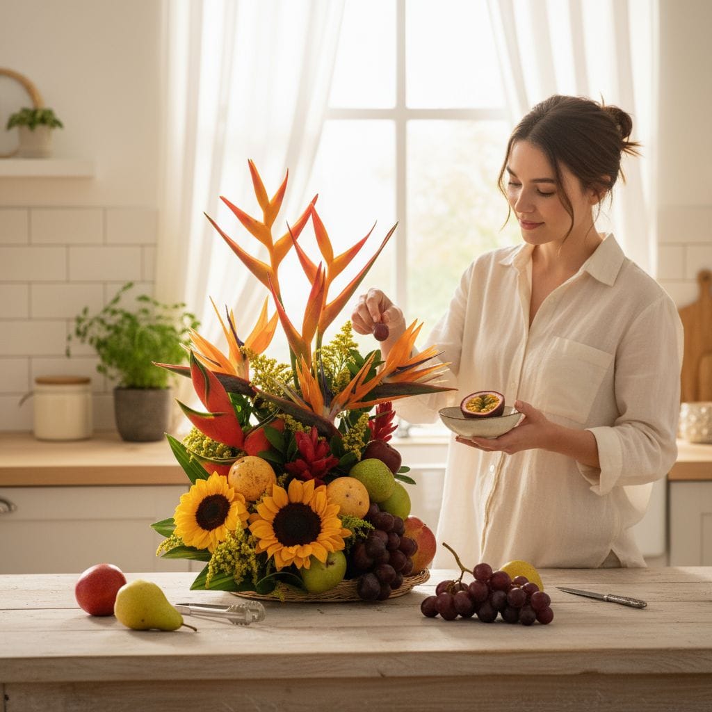 Una celebración exuberante de la naturaleza en su máxima expresión. Esta canasta combina la energía luminosa de los girasoles, la elegancia escultórica de las aves del paraíso y una selección de flores tropicales que aportan textura, color y carácter. Acompañadas por frutas frescas y variadas, cuidadosamente seleccionadas por su calidad y presentación, esta composición ofrece una experiencia visual y sensorial que transmite vitalidad, alegría y buen gusto.