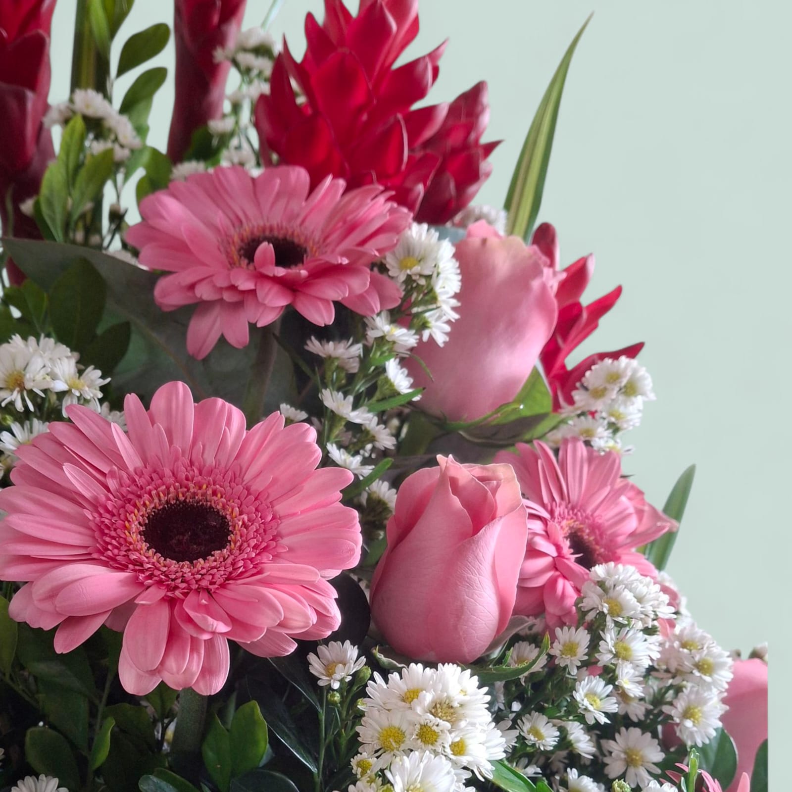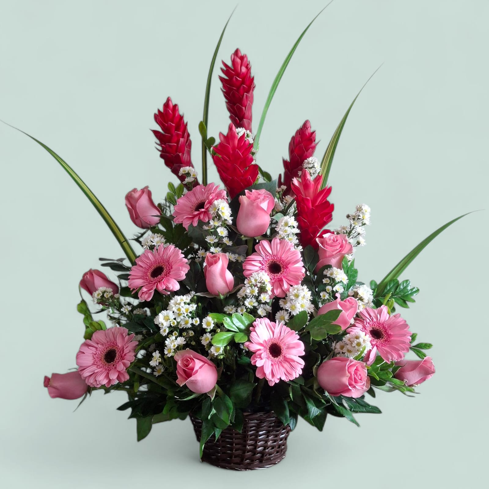 Una celebración de la feminidad, la dulzura y la alegría. Esta encantadora canasta floral reúne 12 rosas rosadas que expresan cariño y admiración, 5 gingers rosadas que aportan volumen y exotismo, y 4 gerberas rosadas que irradian energía y frescura. El resultado es una composición armoniosa, vibrante y delicada, ideal para regalar en cumpleaños, agradecimientos o momentos que merecen ternura y belleza.