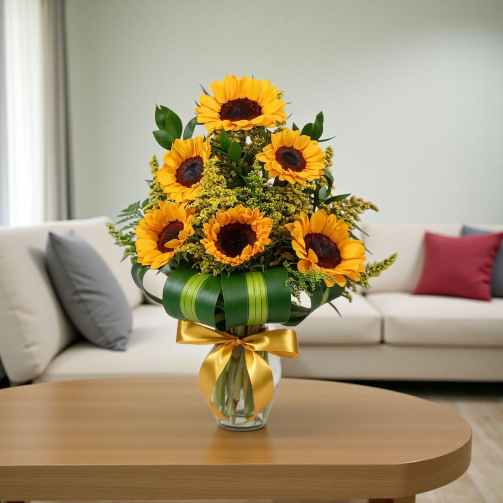 Una explosión de luz y energía positiva. Este florero presenta 6 girasoles grandes (o 8 a 10 medianos, según disponibilidad), cuidadosamente seleccionados por su frescura, tamaño y color vibrante. Los girasoles evocan alegría, vitalidad y gratitud, convirtiendo este arreglo en un gesto luminoso que transforma cualquier espacio con optimismo y fuerza natural.