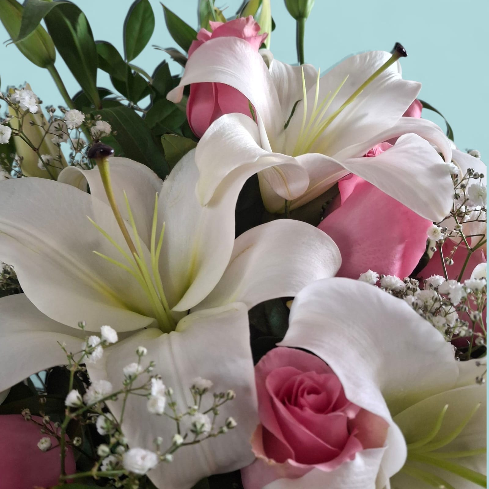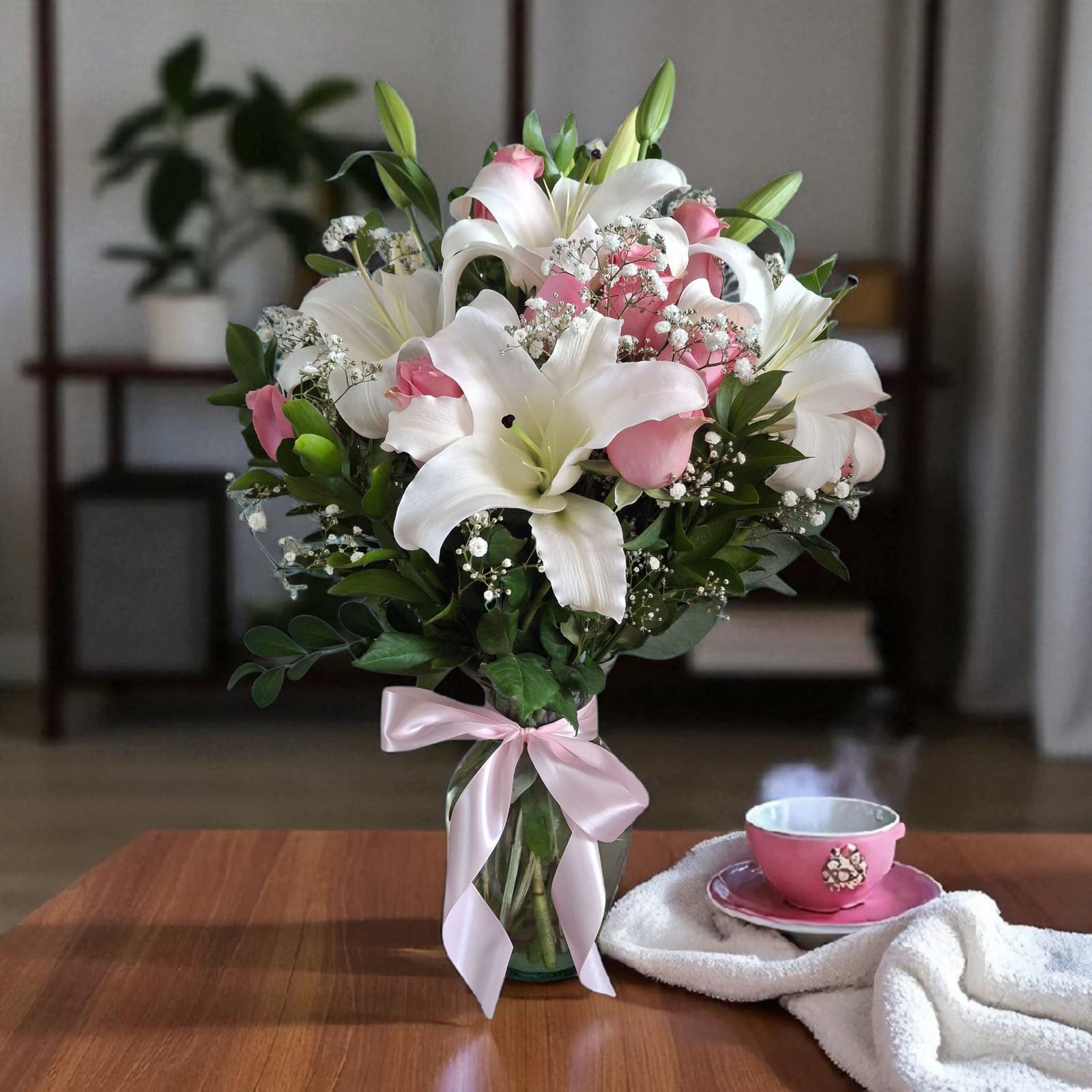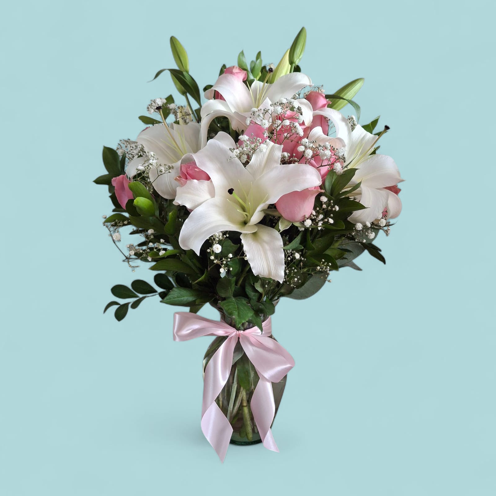 Una composición que transmite ternura, paz y sofisticación. Este florero reúne 10 rosas rosadas de tallo largo—símbolo de cariño, admiración y dulzura—acompañadas por 3 ramas de lirios blancos que aportan pureza, elegancia y volumen. El contraste entre los tonos suaves y la forma escultural de los lirios crea un arreglo armonioso, ideal para momentos que merecen sensibilidad y belleza.