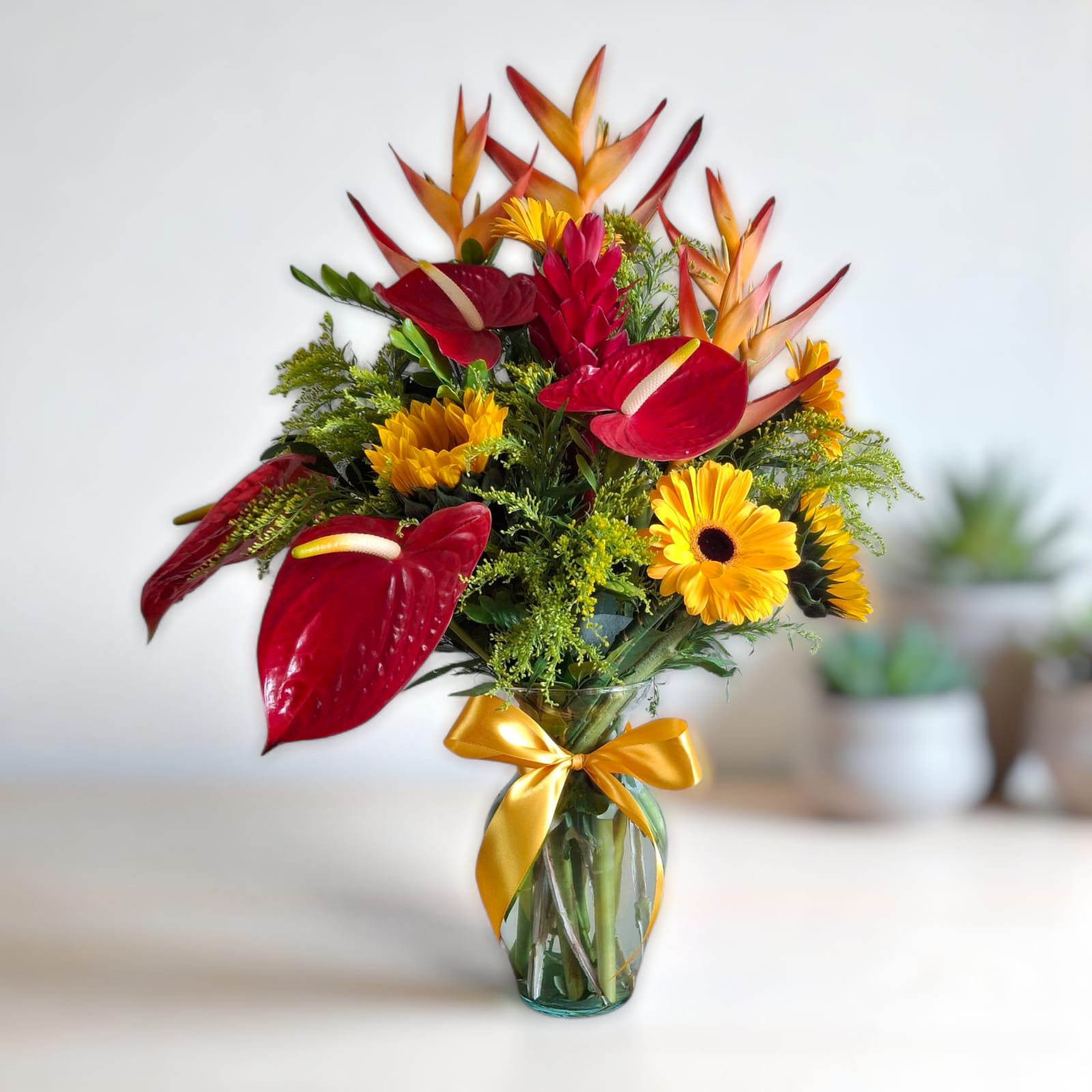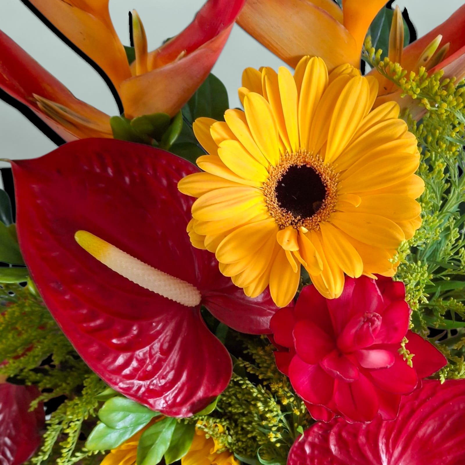 Una explosión de color y energía natural. Este florero tropical fusiona la elegancia exótica de las Aves del Paraíso con la alegría radiante de gerberas y girasoles, mientras los anturios y gingers aportan sofisticación y volumen. Diseñado para impactar, este arreglo es ideal para celebraciones, recepciones o como pieza central que transforma cualquier espacio en un oasis de vitalidad.